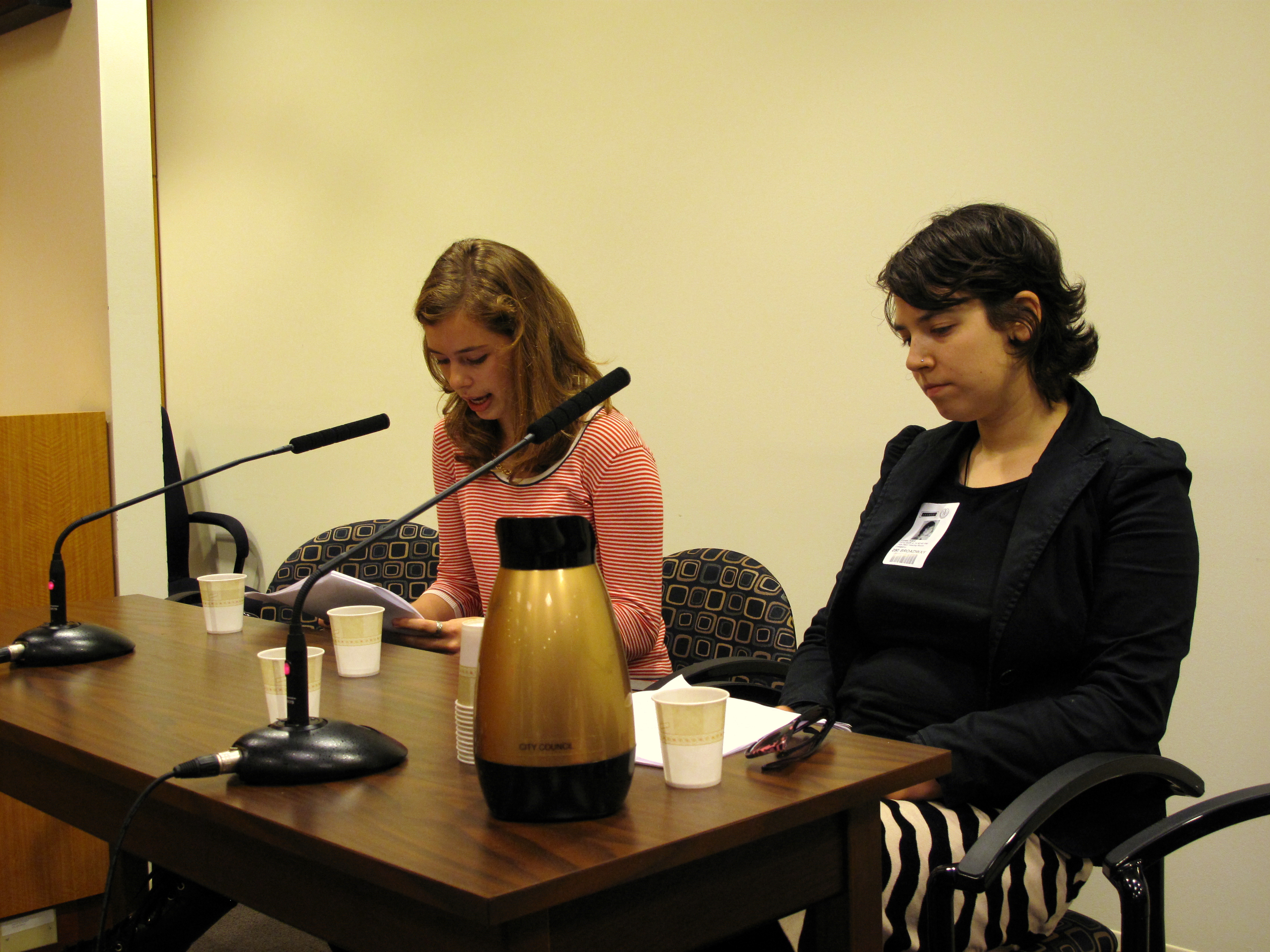 Grace Tobin (left), high school junior, testifies on street harassment at a New York City Council hearing on October 28, 2010 (photo courtesy Holly Kearl).